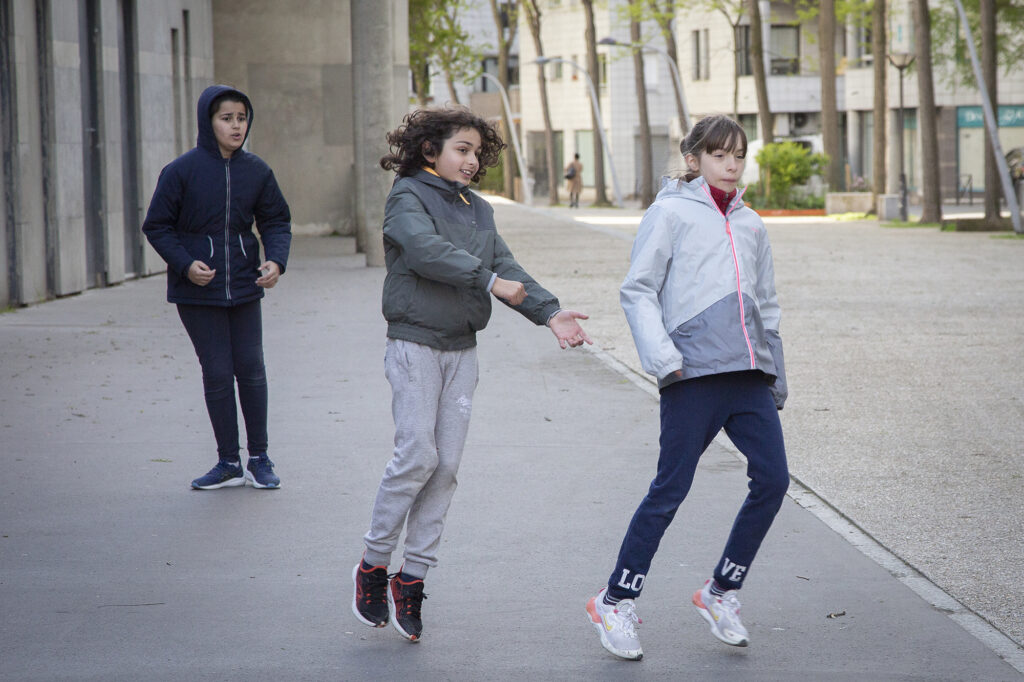 Nombreux sont les comportements et les gestes observés dans le quartier. En rejouant ces actions du quotidien nous proposons une nouvelle écriture de ces gestes ; une chorégraphie induite par le rythme de la rue. L’ architecture guide nos mouvements mais c’est nous qui donnons le tempo. En réalisant la musique électronique et les effets visuels, nous jouons notre propre partition de la ville.